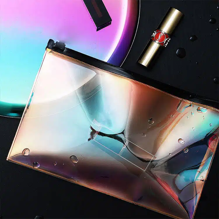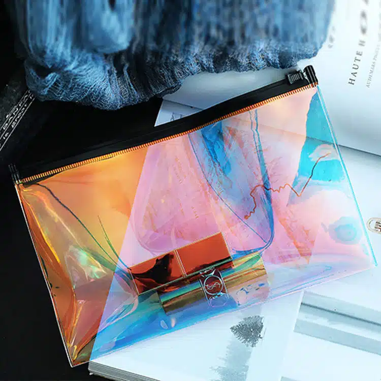 1. Vibrant Aesthetics: Dressed in a phantasmagoria of colors and transparency, this holographic makeup bag stands out, making a bold fashion statement.